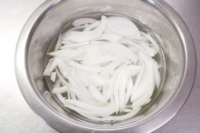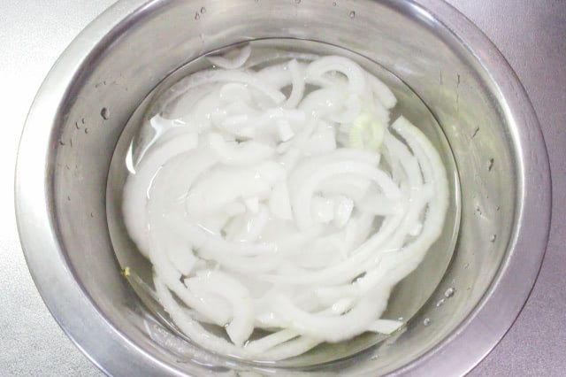 3. 残りの新玉ねぎも上下を少し切り落とし、繊維に沿うようにして薄切りにし、パリッとするまで水にさらします。