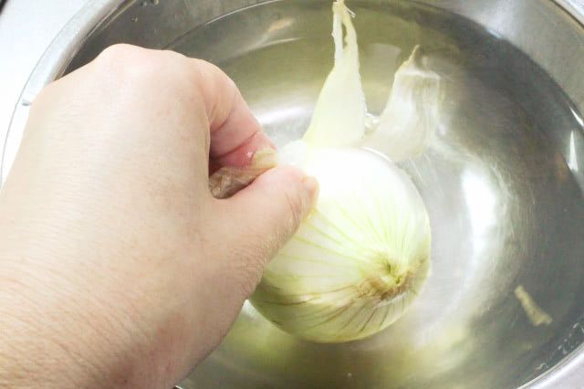 1. 水を張ったボウルの中で新玉ねぎの皮を剥きます。