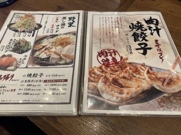 席に着きメニューを開くと「まずはコレ!”肉汁焼餃子”」の文字。やっぱりそうですよね〜!!