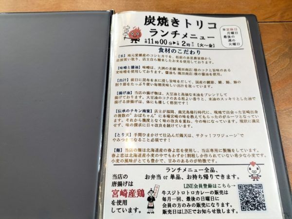国産の宮崎産鶏を使用するなど、食材のこだわりも、メニューに載っています。