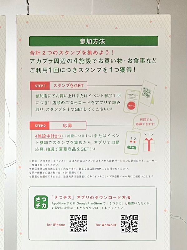 屋外広場「アカプラ」に隣接する4つの商業施設でお食事もしくはお買い物を1回するごとに1スタンプ獲得。2スタンプ集めると豪華プレゼントが当たるキャンペーンに1回応募ができ、上限なく、何回でもエントリーできます。