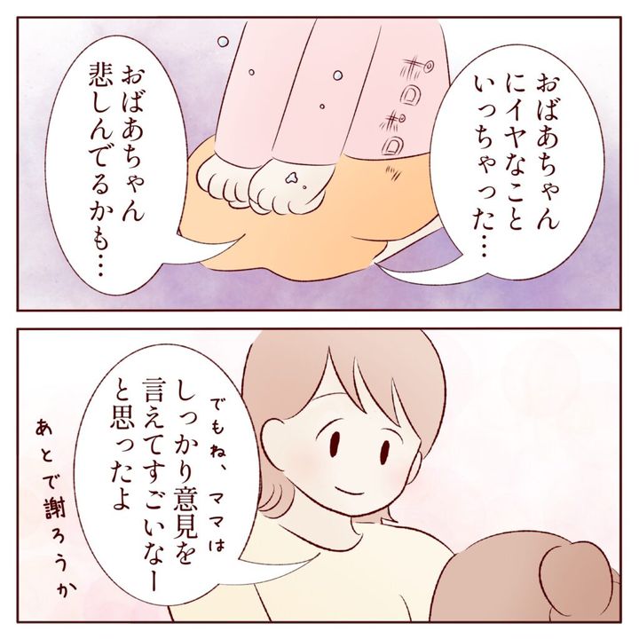 「おばあちゃんにイヤなこと言っちゃった・・おばあちゃん悲しんでるかも・・」とひどいことをされたにもかかわらず、義母を心配するリンに、「でもね、ママはしっかり意見を言えてすごいなーと思ったよ」そう言った後、「あとで謝ろうか」とたずねました。