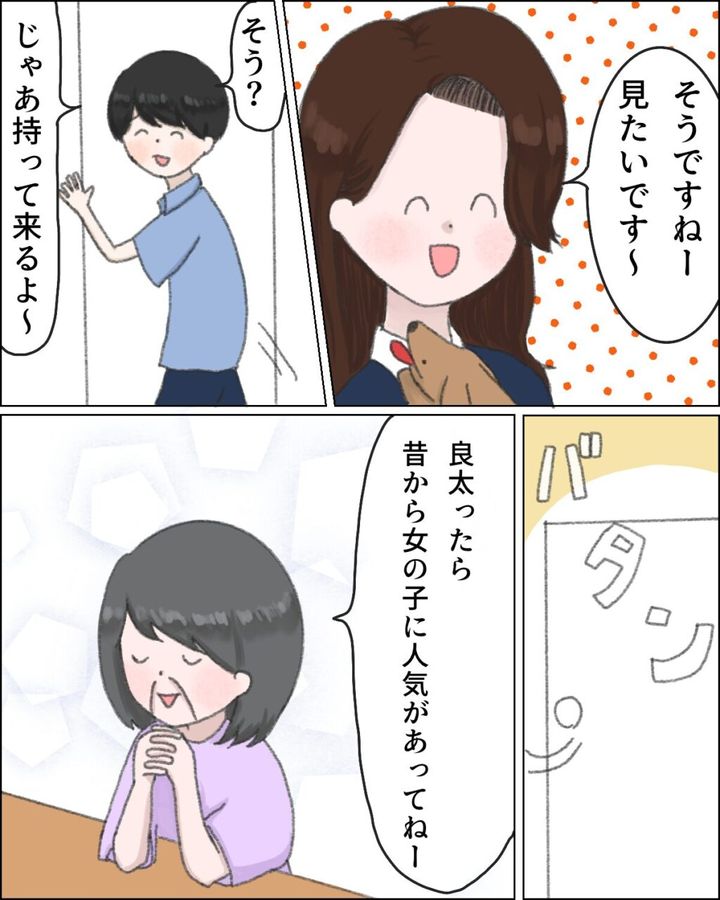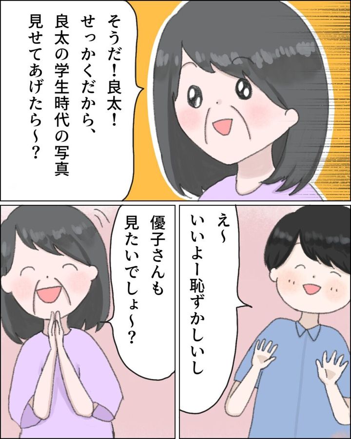すると、「そうだ!良太!せっかくだから、良太の学生時代の写真見せてあげたら~?」と義母が言い出し、「え~、いいよー恥ずかしいし」と照れる良太。そして「優子さんも見たいでしょ~?」と義母が笑顔で言い、