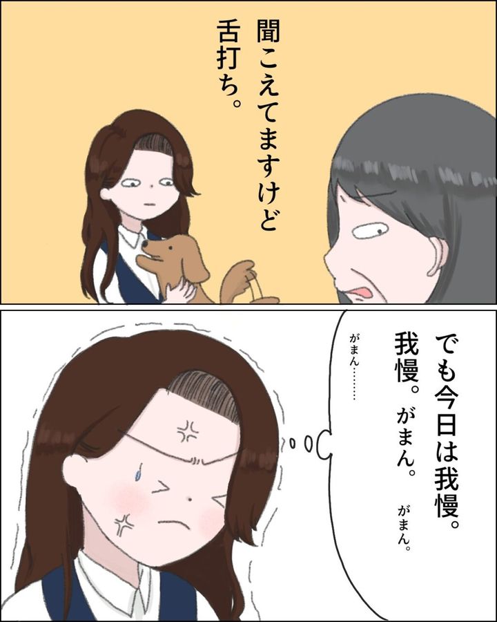 「聞こえてますけど、舌打ち」心の中でそう呟く私。「でも今日は我慢。我慢。がまん・・がまん」と必死に怒りをこらえました。
