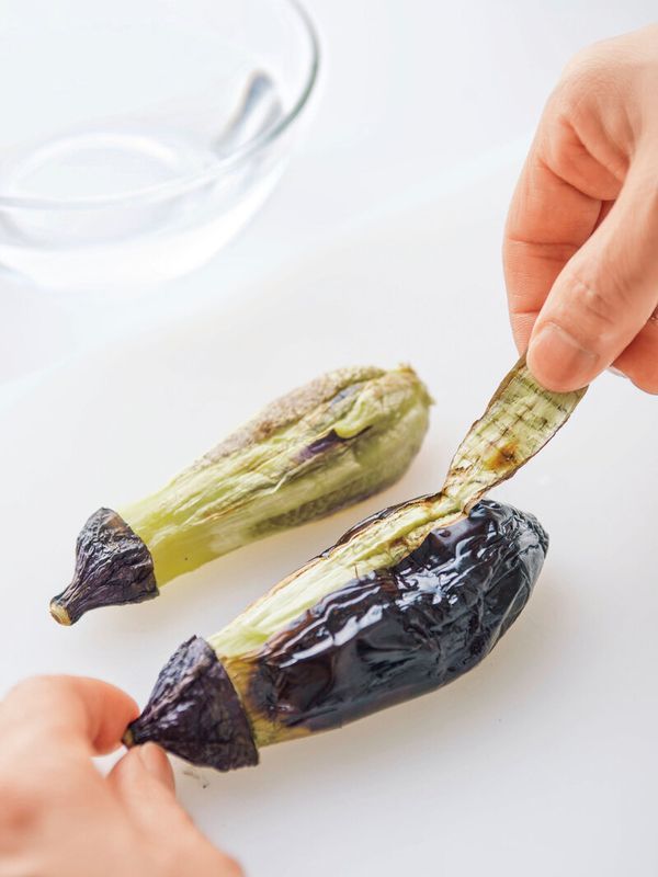 3. 焼きなすの皮がツルンッとむける裏ワザ知ってる?豚しゃぶをのっけて、絶品おかずに。