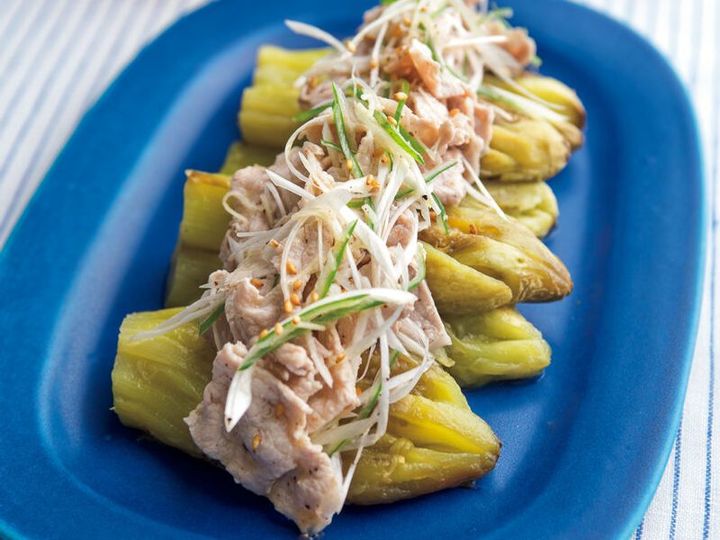 旬のなすをシンプルに味わう、代表的なメニューといえば「焼きなす」。焼きなすにはいろいろな作り方がありますが、ここでは皮つきのままグリルで焼き、皮をむいて仕上げる、定番の作り方をおさらい。独特の甘みやとろっとした食感を引き出すため、強火で一気に焼いた焼きなすに、ごま油をからめた豚しゃぶをのせ、ボリュームおかずに仕上げます。