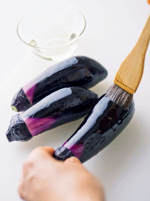 なすの水けを拭き、表面全体に刷毛で(なければ指で)サラダ油をなるべく薄く塗る。
