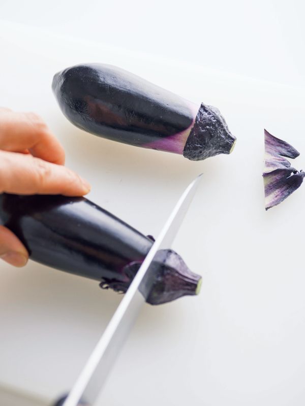 なすはへたのまわりに包丁でぐるりと切り目を入れ、がく(ひらひらした堅い部分)を取り除く。しょうがは皮をむき、せん切りにする(皮はとっておく)。ねぎは縦半分に切ってから、斜めに細切りにする。水にさらし、パリッとしたら水けをきる。
