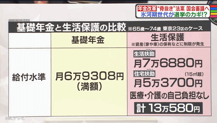 政治ジャーナリストの青山和弘氏いわく「就職氷河期世代の約1700万人を支援しないと、将来は生活保護者が増えちゃうんじゃないか」とのこと。青山氏は、基礎年金と生活保護の比較図を出して「最初から生活保護をあてにした方が得じゃないかって議論だって成り立つ」とコメント。さらに「この逆転現象……まあ、厚生年金があれば全然別ですけど、基礎年金だけだとこうなっちゃっている現状で、さらにここから3割下がるんです、30年後には。こんなんで日本は成り立つのか?」と深刻な現状を解説した。