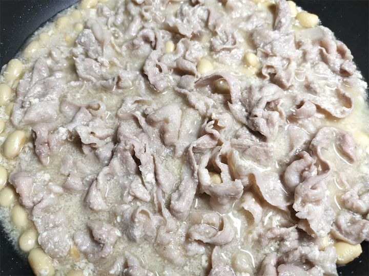 7. フライパンを強火にかけて豚肉を移動させながら火を通し、沸騰する寸前で火を止めます。