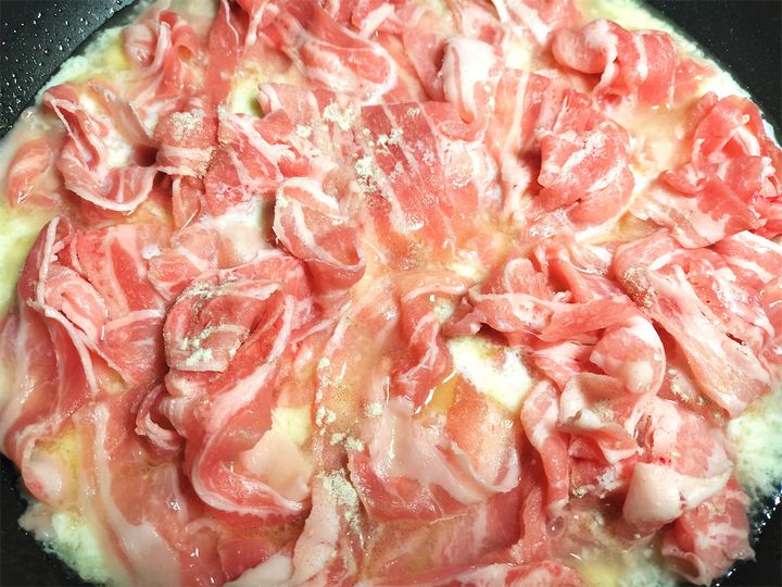 6. 火を止めた状態のフライパンに、豚肉を並べながら入れます。