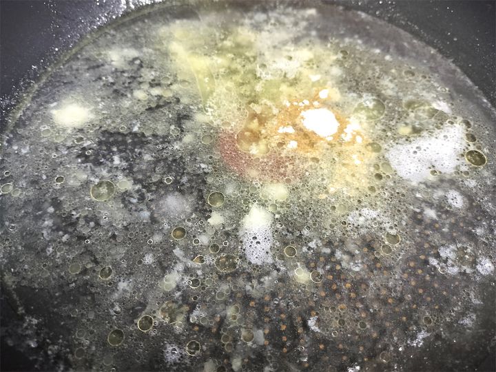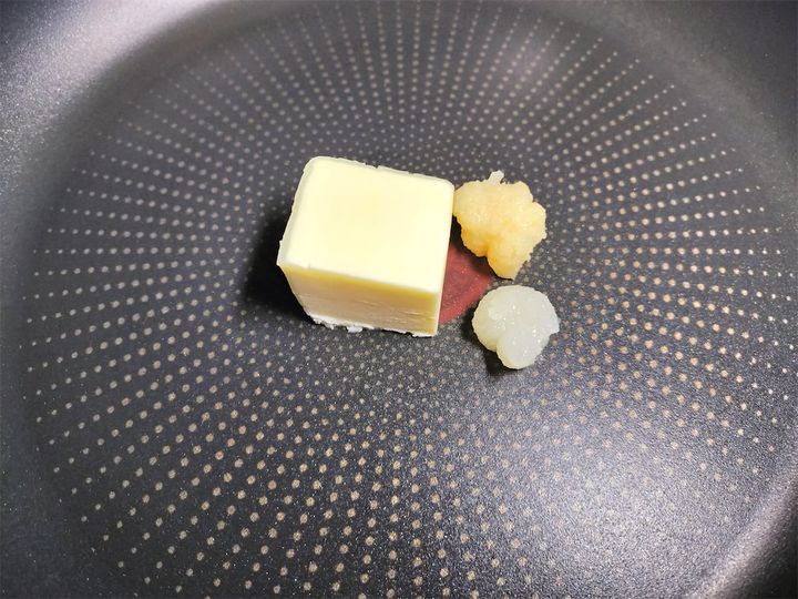 1. フライパンにバター、にんにく、しょうがを入れ、中火で熱しながら混ぜます。