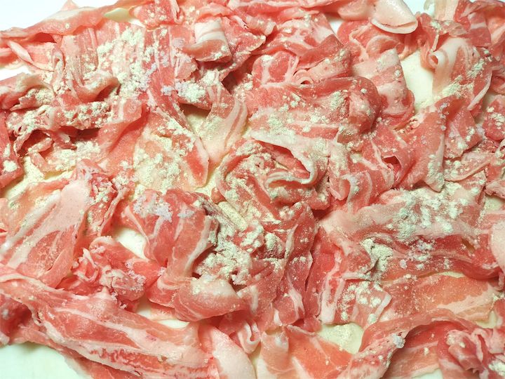 5. 豚肉を広げて塩、白こしょうで下味をつけます。