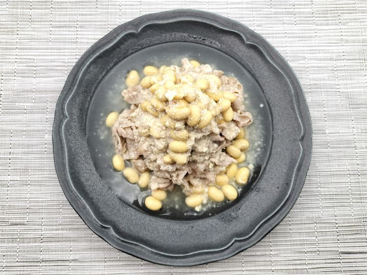 一時期の健康ブーム以来、豆乳を使った鍋は珍しくなくなりましたが、野菜も入れずに豚肉と大豆だけというレシピにはびっくりしました。しかも肉から出汁が出るからとめんつゆの類も使わずに、バターと塩こしょうという味付けにも驚きです。ところがいざ口に運んでみると、豆乳の柔らかさと豚肉の味がバランスよく、一緒に口に入ってくる大豆の食感も加わってミルキーな旨味でいっぱいになりました。しゃぶしゃぶ用の薄切り肉を使っていますので余熱で充分に火は入っていて、スープもおいしくてコクがあり思ったよりやさしい味の和食とフレンチのコラボな一皿になりました。