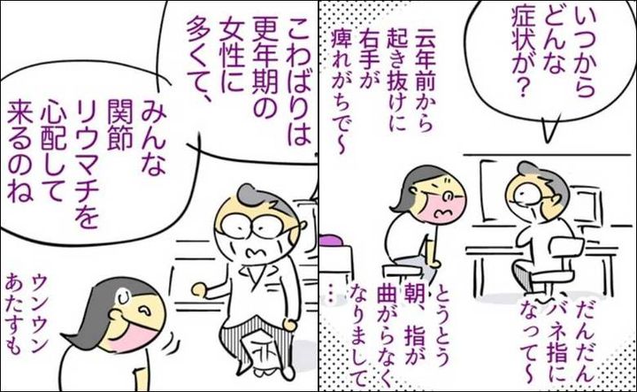 へそさんは更年期になってから朝起きたときに、右手の指がうっすらしびれていたことがあったそう。さらに、日に日に指が曲げにくくなってきて、整形外科を受診することにしました。