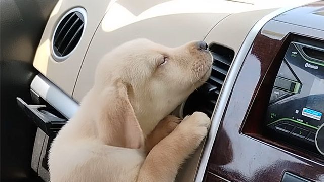 涼しさ全力確保! エアコンに張りつく子犬さんの表情がたまらない