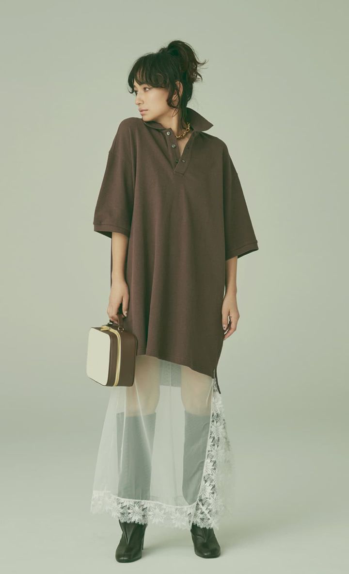 ビッグサイズのポロシャツの中に潜ませたのは、パリのランジェリーブランド、ヤスミン エスラミのスリップドレス。ロングブーツで肌の透け感バランスを調整すると着こなしやすい。ポロシャツ¥24,200(アンスクリア/アマン)、中に着たスリップドレス¥49,500(ヤスミン エスラミ/ガブリエル ペコ)、バッグ¥231,000(リュニフォーム/リュニフォーム トウキョウ)、ネックレス¥28,300(portray jewelry)、ロングブーツ¥29,990(ザラ/ザラ カスタマーサービス)