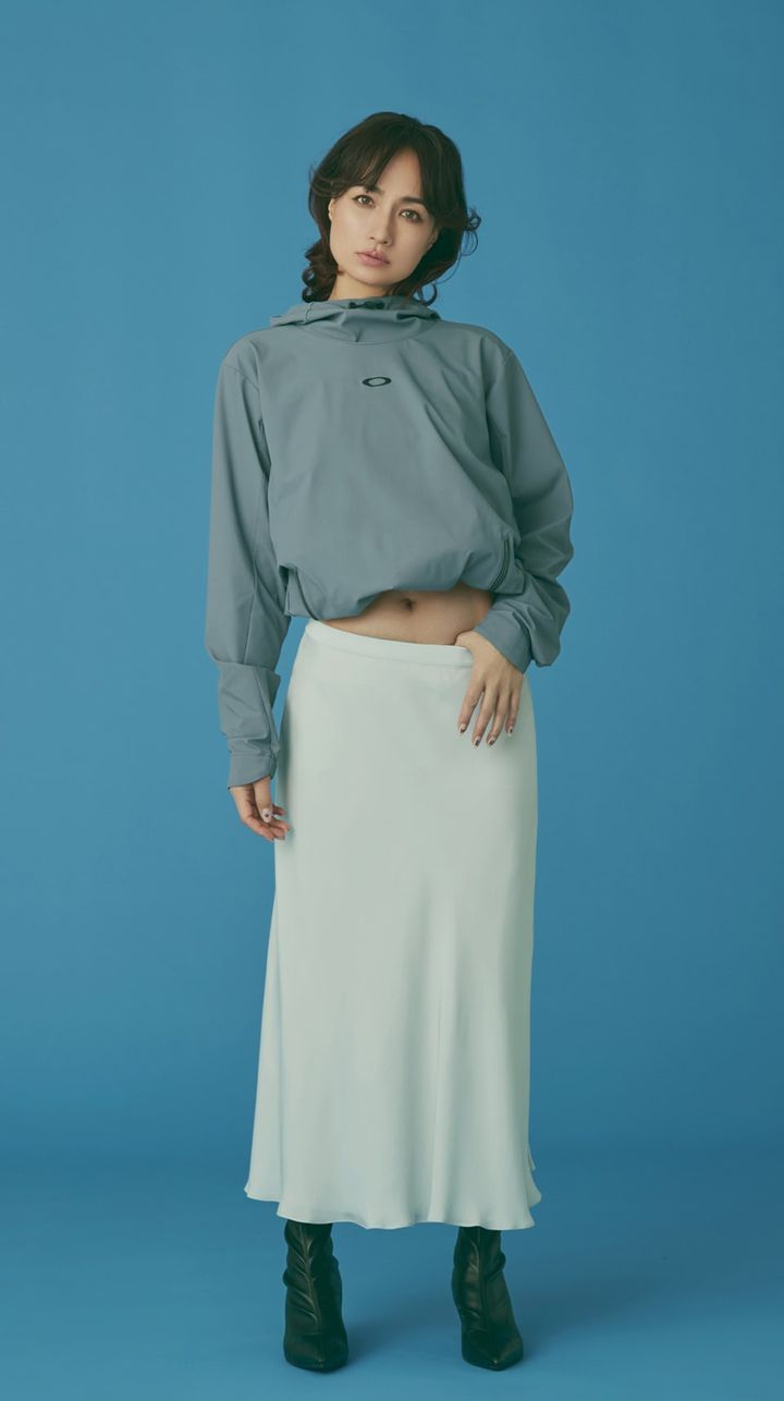 グレートーンで全体をシックにまとめて。こういったトレーニングジャケットは裾が絞れるタイプも多いので、キュッとして、チラッと肌見せするのもヌケ感が出る着こなしテク。ウインドブレーカー¥15,400(オークリー/ルックスオティカジャパン カスタマーサービス)、スカート¥49,500 (セオリー/リンク・セオリー・ジャパン)、ブーツ¥46,200 (ファビオ ルスコーニ/伊勢丹新宿本店 本館2階 婦人靴)