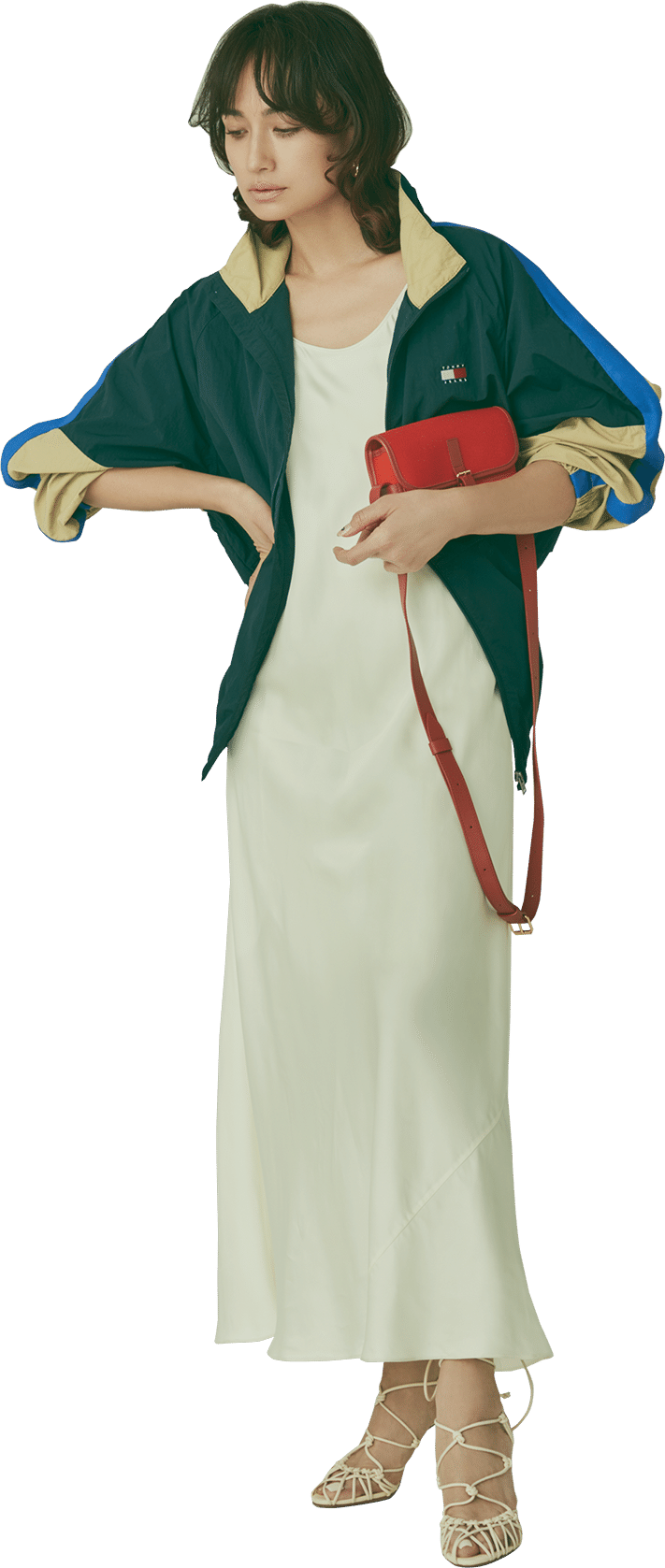 配色がおしゃれなブルゾンは、合わせるアイテムをシンプルかつ女性らしさが際立つ質感に。ブルゾン¥25,300(トミー ジーンズ/トミー ヒルフィガー カスタマーサービス)、ドレス¥41,800 (カルバン・クライン/カルバン・クライン カスタマーサービス)、バッグ¥113,300(リュニフォーム/リュニフォーム トウキョウ)、ピアス¥64,900 (トムウッド/トムウッド 青山店)、サンダル¥132,000(フォルテ フォルテ/コロネット)