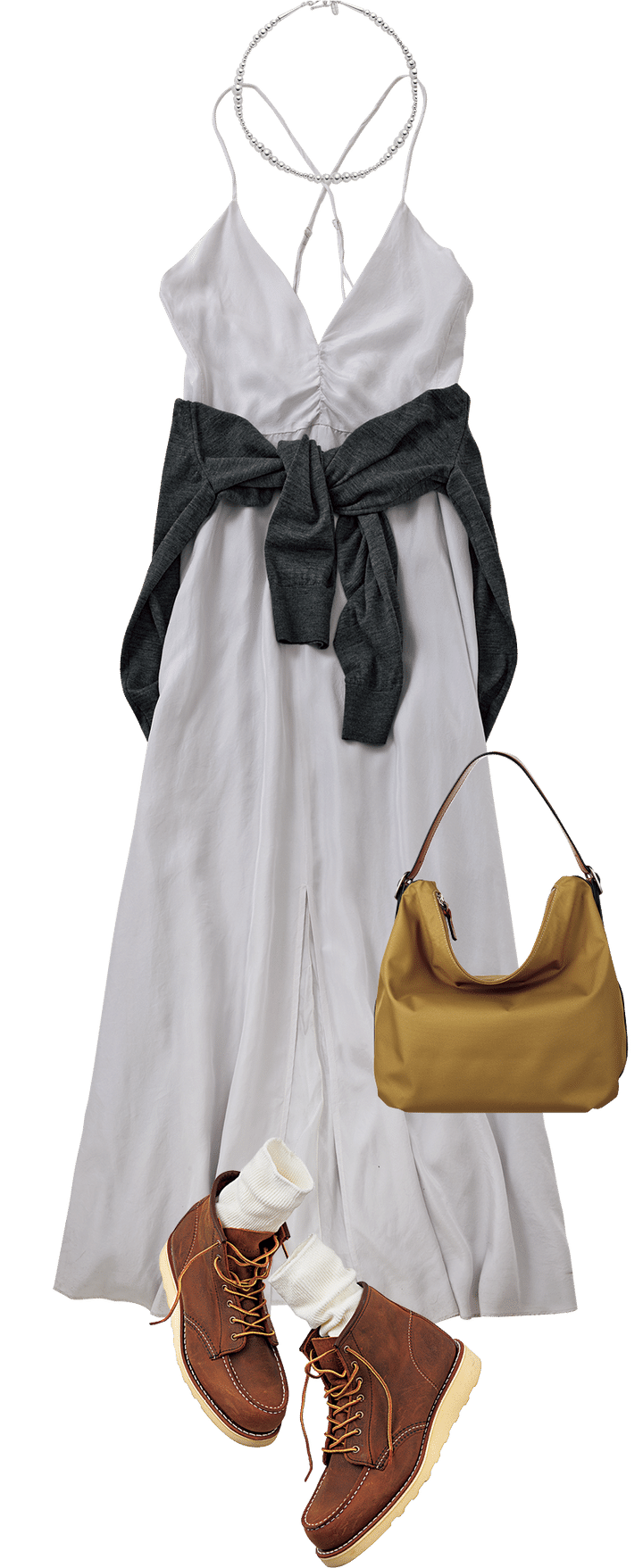 ドレス¥152,900(フォルテ フォルテ/コロネット)、腰に巻いたニット¥35,200(ウメダ/ウメダニット)、バッグ¥26,900(トゥティエ)、ブーツ¥51,150(レッドウィング/レッドウィング・ジャパン)、ネックレス¥32,000(quipqueint/フーブス)、ソックスはスタイリスト私物