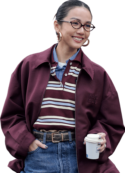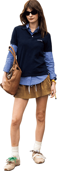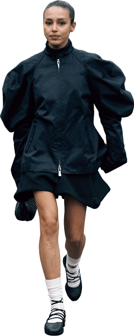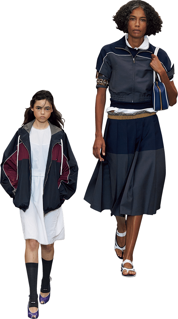 ミュウミュウのプレッピーなスクールガールルックにジップブルゾンを合わせた着こなしに一目惚れした人は多いはず。そんなスタイルに挑戦するためにも、今シーズンは、シャカッとしたテック系素材の質感を取り入れたアイテムがマストバイ。ファッションブランド発のデザイン性が高いシックなものを狙って。