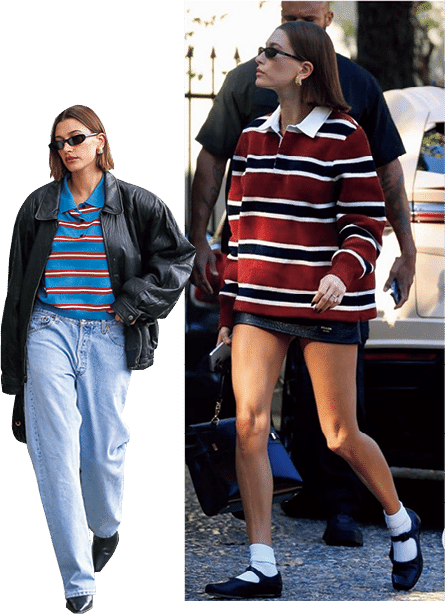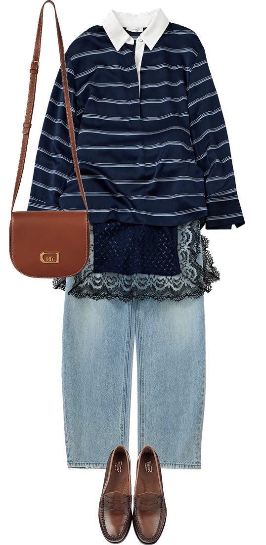 ボーダーポロやラガーシャツは、ついデニムでシンプルに仕上げがちだけど、裾からチラリとレースを覗かせてみて。スタイリングがグッと複雑みを増して脱ストリートに。レースは同系色を選んでなじませると◎。