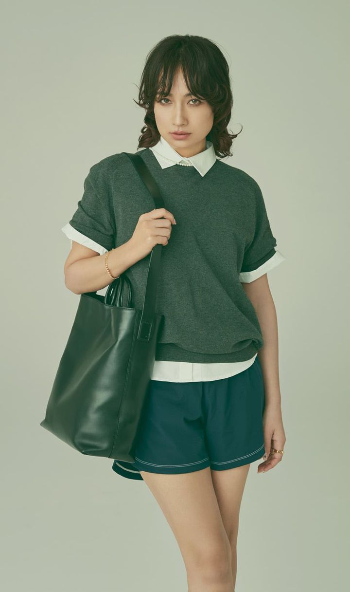 ショートパンツ¥9,900(アー・ペー・セー アシックス/アー・ペー・セー カスタマーサービス)、シャツ¥37,400(アロー)、トップス¥24,200(カルバン・クライン/カルバン・クライン カスタマーサービス)、ネックレス¥56,100(ビジュードエム/ビジュードエム六本木ヒルズ)、バッグ¥90,200(メゾン カナウ/ヤマニ)、ブレスレット¥61,000、左手人さし指のリング¥270,400(共にトムウッド/トムウッド 青山店)