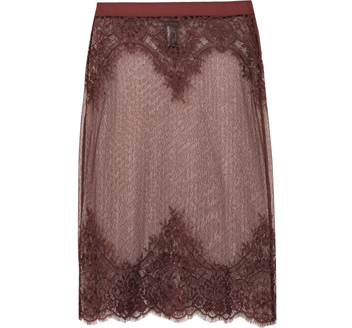 ボーイズライクな色みで渋めに仕上げたスタイリングに、トレンドカラーでもあるバーガンディーのレーススカートをレイヤード。ハッとする女っぽさが薫りつつも、セクシーになりすぎないモダンさがあるところがポイント。この1枚があるかないかの差は大きい。