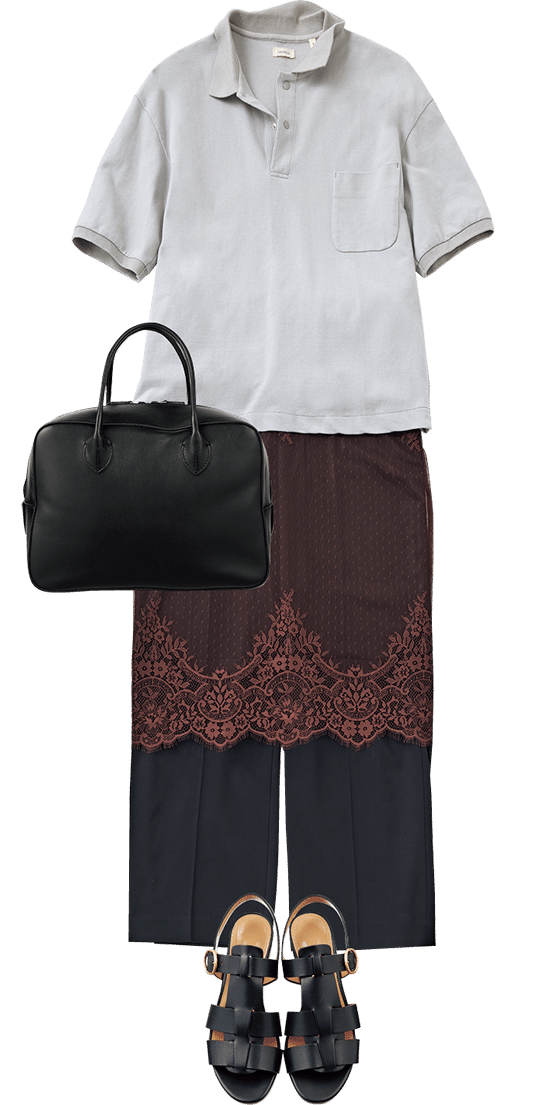 ポロシャツ¥19,800(ナナミカ/ナナミカ D.W.S.)、レーススカート¥6,590(ザラ/ザラ カスタマーサービス)、スラックス¥17,600(コードエー/ワールド プレスインフォメーション)、バッグ¥79,200(メゾン カナウ/ヤマニ)、サンダル¥82,500(ペリーコ/アマン)
