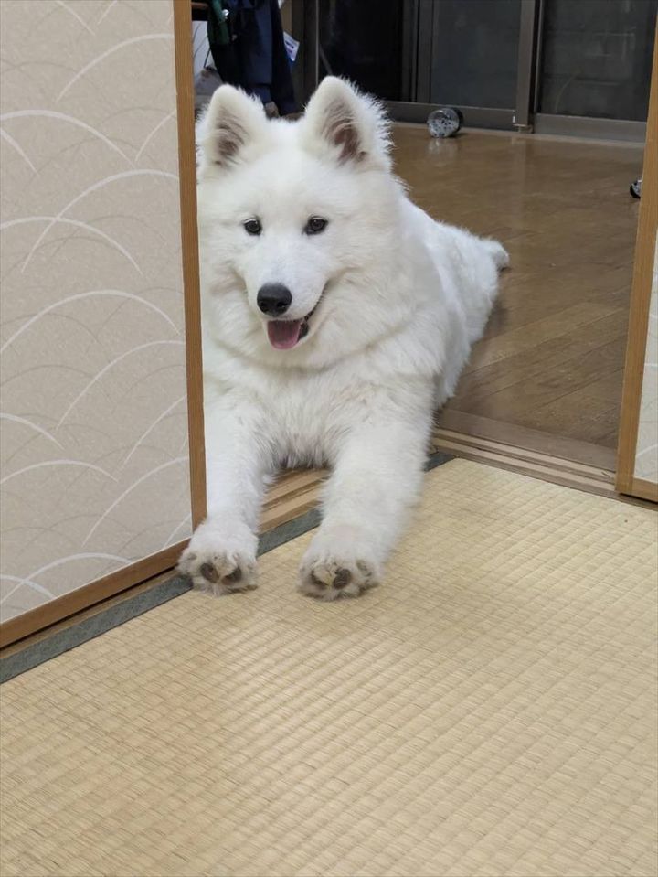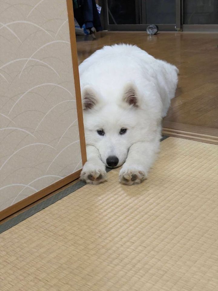 部屋の外から、おててを伸ばしているのは、サモエドの『さだはる』くん。 どうやら、寝室に入ったら怒られるということは知っているようです。 それでも、少しでも飼い主さんのそばにいたいみたい。