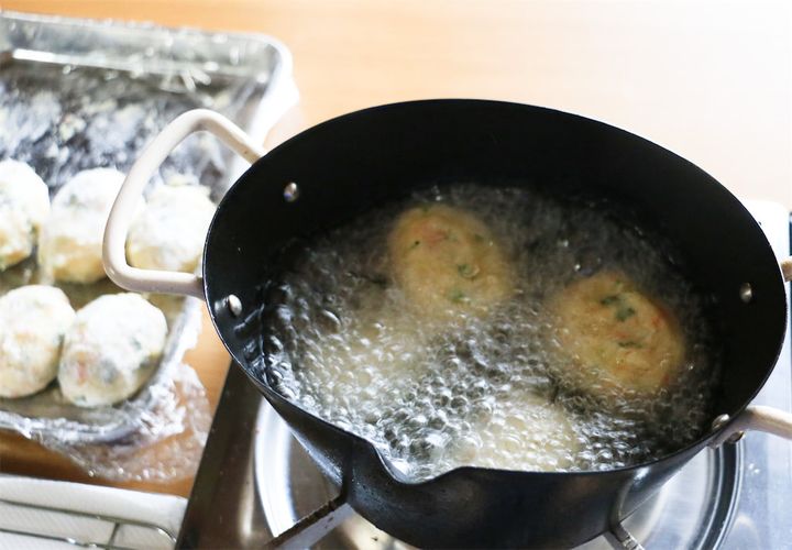 大きさがまちまちになってしまったけど…小さいことは気にせず最後の工程へ!揚げていきます!