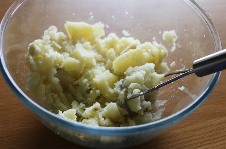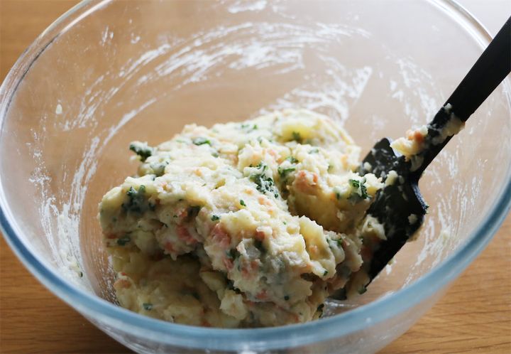3.じゃがいもが熱いうちに皮を剥き、マッシャーかすりこぎで滑らかになるまで潰し、残りのコロッケだねの材料を加えて滑らかになるまでこねる。