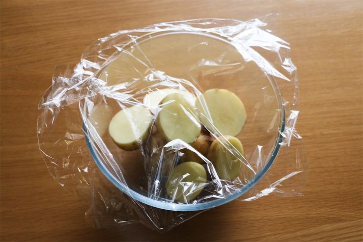 2.じゃがいもを洗い皮つきのまま半分に切り、濡れたまま耐熱皿に載せラップをかける。電子レンジ(600W)で6分ほど加熱する。