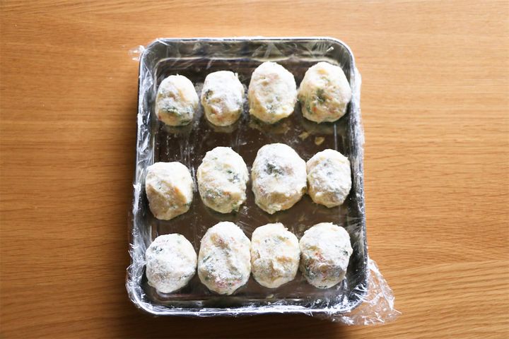 4. 3のコロッケだねを12等分し、空気を抜くようにして小さめの卵形にする。小麦粉少々を手のひらに付けてコロッケだねを包み込むようにして粉を軽く付け、170℃に熱した油できつね色に揚げる。
