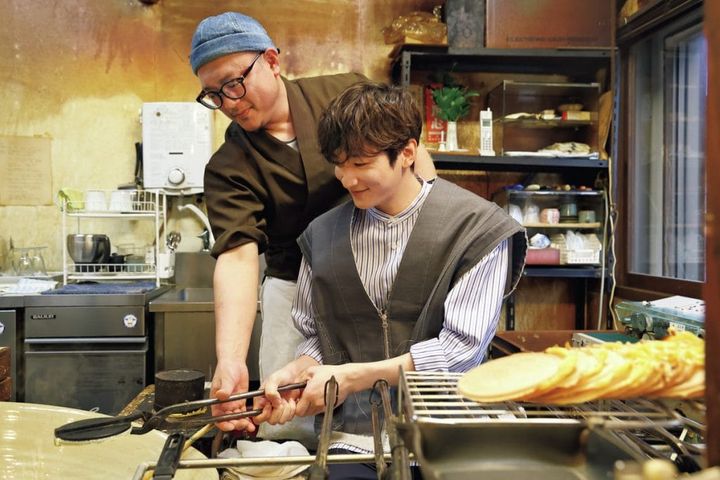 続いて、小関さんが挑戦したのは「湯せんぺい」の手焼き体験。『界 雲仙』から歩いてすぐの「遠江屋本舗」は、今でも手焼きで一枚一枚焼き上げる、雲仙で唯一の湯せんぺい店です。
