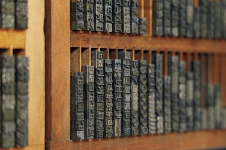 壁一面に飾られているのは、かつて新聞を作るために使われていた印刷所から譲り受けた活版文字。活版文化を伝えるために装飾に使われています。