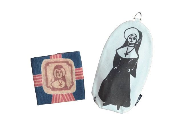 洋画家・鈴木信太郎さんのシスターの絵がかわいい、長崎銘菓「クルス」のオリジナル。ほかにポーチや手ぬぐいも。ガーゼハンカチ ¥1,500、ペンケース ¥1,500