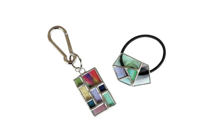 『界 雲仙』で見つけたアイテム。教会の窓に使われていたステンドグラスが身近なアイテムに。キーホルダーはホテルの鍵にも使用。 Arte.M STAINEDGLASS キーホルダー¥6,050、ヘアゴム¥6,600