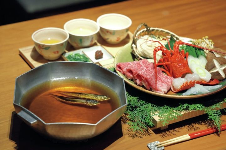 夕食は湯せんぺいと豚角煮リエットの先付けからスタート。メインは、あご(とびうお)を使った出汁を最大限に楽しめるしゃぶしゃぶ。和牛ロースに伊勢海老、フグ、島原の手延べうどん「紅椿麺」という贅沢尽くし! 壱岐のゆずの皮を使った薬味「ゆべし」とともに、出汁文化を堪能して。