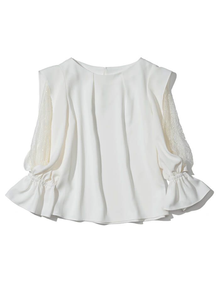 首元がすっきり見えするUネック。袖の一部がレースになった技ありデザインで甘く引き算して、大きく見えがちな上半身に抜け感を演出。