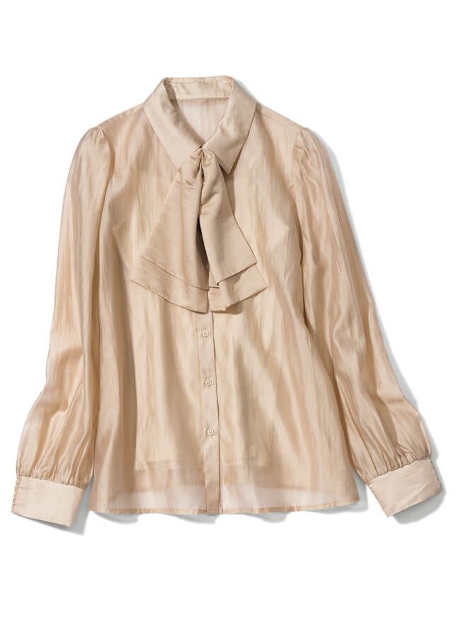 スマートなタイ付き&ツヤっぽいシアー素材は肌にハリ感のある骨ストレディにぴったり。センシュアルなベージュシアーで大人の品もしっかり。