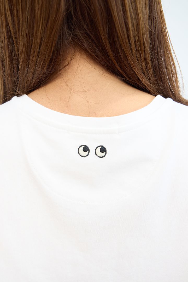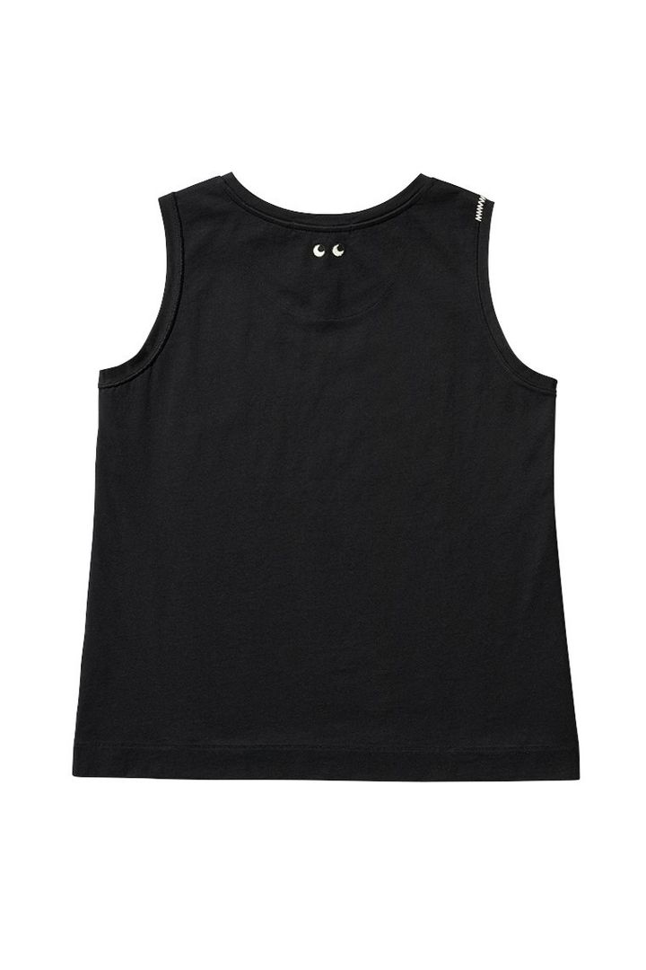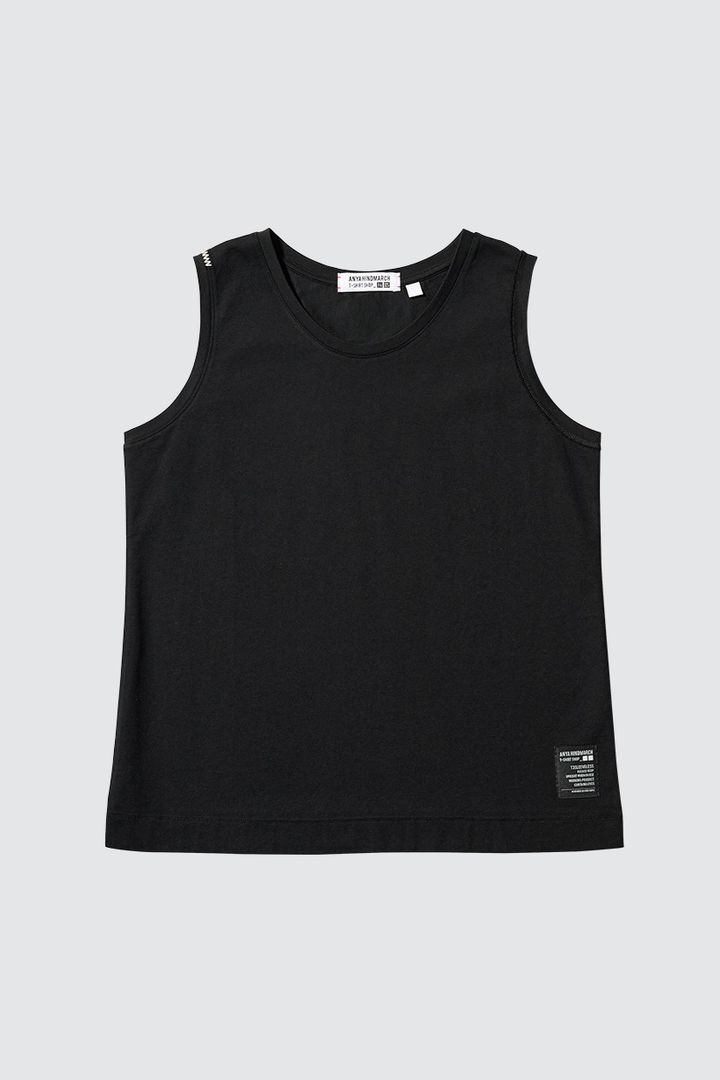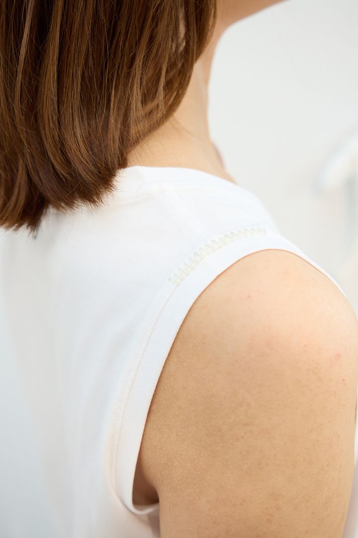 体のラインを拾わないややAラインシルエットのノースリーブT。アウトでも着やすいので30代40代におすすめです。肩のラインがやや内側に入っているため、肩周りがキリッと引き締まり、アメスリのようなスタイリッシュさを味わえます。アームホールは少し広めなので、気になる方はワンサイズダウンさせるのがおすすめ。左肩は縫い目を表に返したようなデザイン、右肩はハンドステッチ風のジグザグステッチ入りと、左右で異なるのもアニヤらしさ満点です。