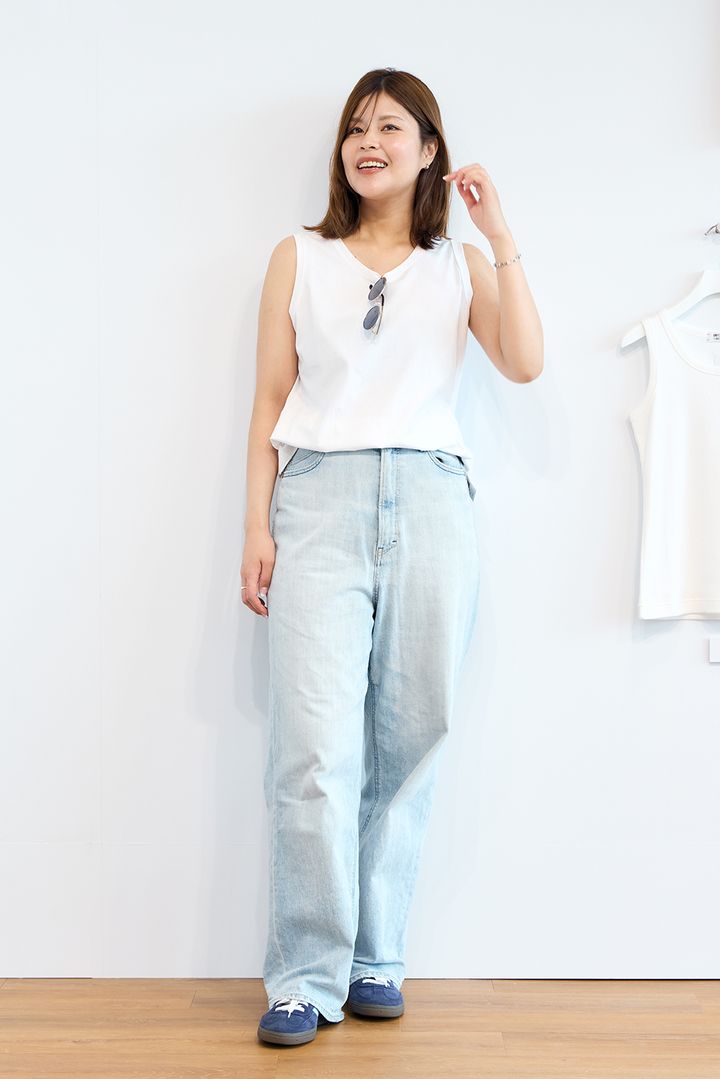 ハリのある素材と深めのUネックで、デニム合わせでも大人なカジュアルバランスに仕上がります。裾はフロントだけインしてブラウジングさせるのもおすすめ。「00 WHITE]は若干透けるので、ブラキャミなどを合わせると安心。