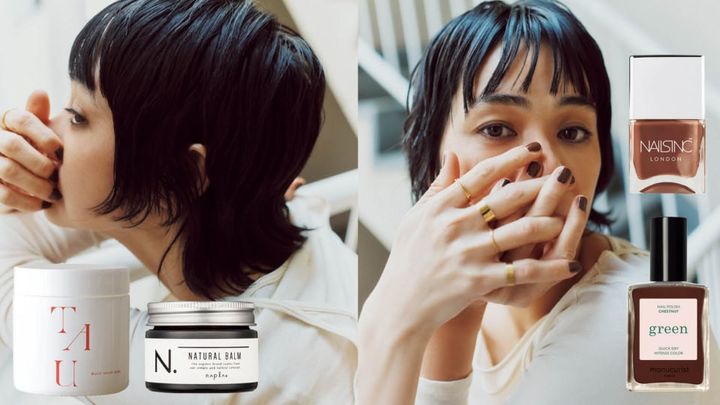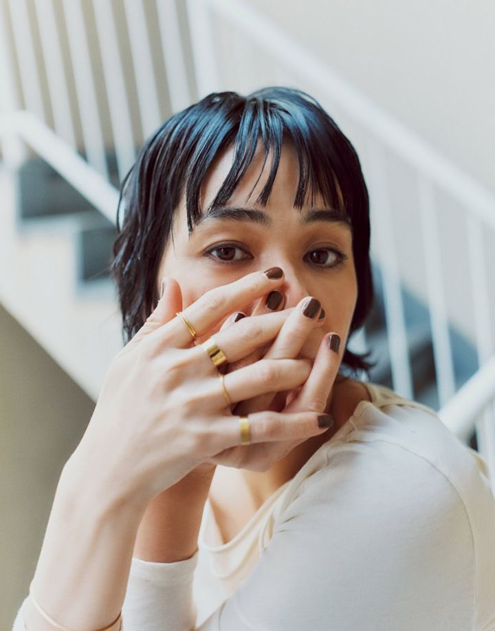 シンプルな格好で素爪はちょっと……。手は意外と人に見られているパーツでもあるので、サボらずちゃんと旬な色のネイルを塗るべき。赤ほど強くなく、分かりやすく洒落感が出るブラウンは、撮影のときにもよく指名します。あと手元でいうと、昔からずっと細いリングを着けるのが好き。さり気ない女らしさって魅力的だなと改めて。
