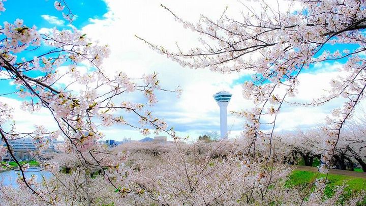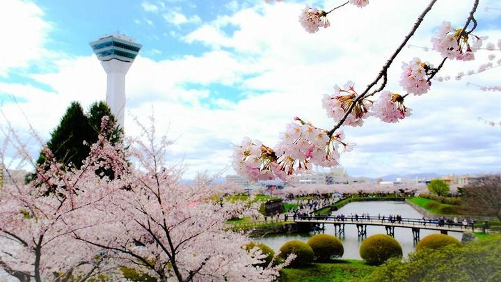 五稜郭タワーが顔をのぞかせ、咲き乱れる桜とのコントラストがとても印象的。青空に映える白いタワーと淡いピンクの桜の組み合わせは、ここでしか見られない春の風景です。