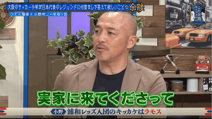 小野が子どもの頃から大好きだったJリーガーとは、ヴェルディ川崎(当時)の司令塔として活躍し、今年で来日48年になるレジェンド、ラモス瑠偉。彼が「覚えてないかも知れないけど誰があなたを浦和レッズに行かせた?」と質問すると、小野は「ラモスさんです」と即答した。