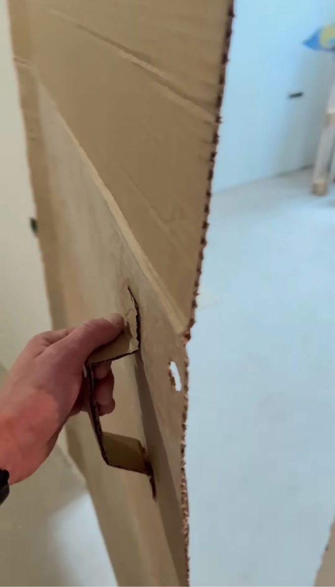 ドアノブも同じくダンボール製です。 握って手前に引くと、きちんと開閉できる仕組みになっており、見た目だけでなく機能面でもドアとしての役割を果たしています。