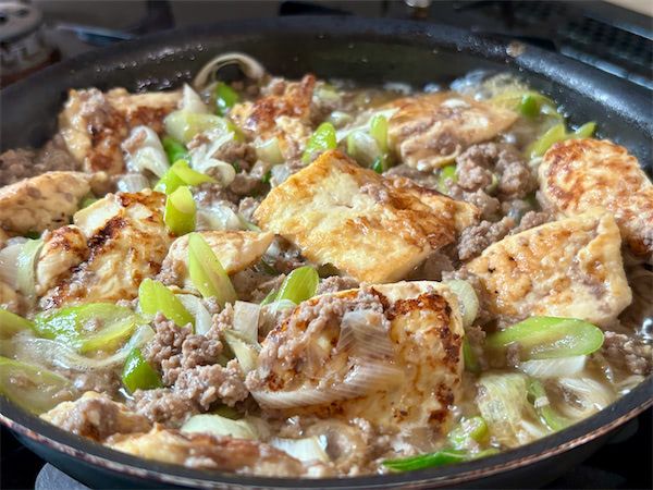 いただきます。ひき肉がおいしい♡ひき肉に味が染み込んでいて、ふんわりとやわらかいです。味付けも甘すぎず、甘辛具合がちょうどいいですね。豆腐は外側が香ばしく、中は適度に水分が抜けふるふるです。ひき肉から出た脂と旨味が、豆腐と長ねぎのあっさりとした食材に絡み、バクバク食べられちゃいます。動画によると、ご飯にかけて丼にし、七味や山椒を好みでかけてもおいしいそうです。