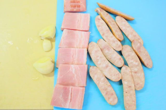 2. 皮を剥いたにんにくを潰します。ベーコンは食べやすい厚さに、ソーセージは縦半分に切ります。