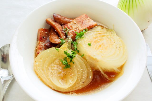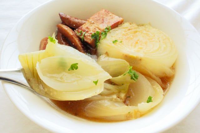 ベーコンとソーセージも入っていますが、半分に切った新玉ねぎの大きいこと!料理名通り、新玉ねぎが主役になっています。